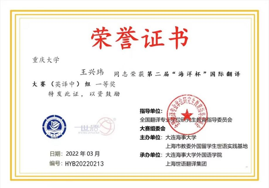 2021级翻译硕士王兴玮于众多参赛选手中脱颖而出,喜获英译中组一等奖。赛后,她向同学们分享了获奖感受。她谈到,“首先,要放平心态,保持对翻译的热爱,每次我只想着拿奖,就会压力很大,很难专心投入。第二,要分泛读和精读理解原文,泛读掌握文章结构和逻辑,精读正确理解内容,不要还没阅读全文就直接翻。最后还要多次润色校对。完成译文初稿后,分“硬伤”和“内伤”查证校对,硬伤就是漏译、错译、格式、标点等,内伤是关注译文是否流畅,是否符合表达习惯、文体风格等。”