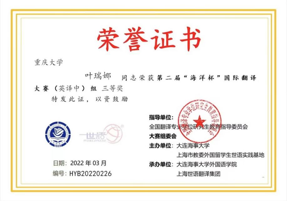 学生参与学科竞赛取得的又一项荣誉,也充分体现了学院对翻译学科竞赛、学生能力发展一如既往的重视与支持。期待更多同学能在各项比赛中提高专业水平,发挥语言优势,努力成为兼具国际视野和家国情怀的外语人才。