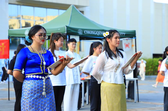 下午,来自印度尼西亚、缅甸、也门、俄罗斯等国的留学生以及汉语国际教育专业硕士研究生开展了户外庆祝活动。活动包括快闪表演和书法、中国结、剪纸等中国传统文化展示。