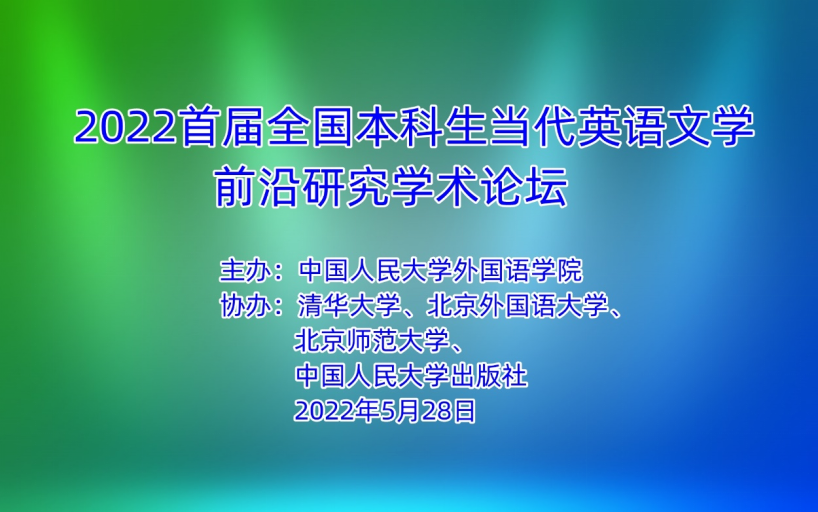 2022年5月28日,由中国人民大学主办、清华大学、北京外国语大学、北京师范大学、中国人民大学出版社协办的首届全国本科生当代英语文学前沿研究学术论坛通过腾讯会议线上平台顺利举办,论坛聚焦当代不同的理论视角(后现代主义、后现代生态学批评、生态后现代主义、深生态学、社会生态学、生态女性主义、后现代文学伦理学批评、后人文主义等),在疫情等世界性问题突出的当下,鼓励学生以知识分子的责任与担当,从文学中挖掘人类当前问题症结所在并找出解决办法。