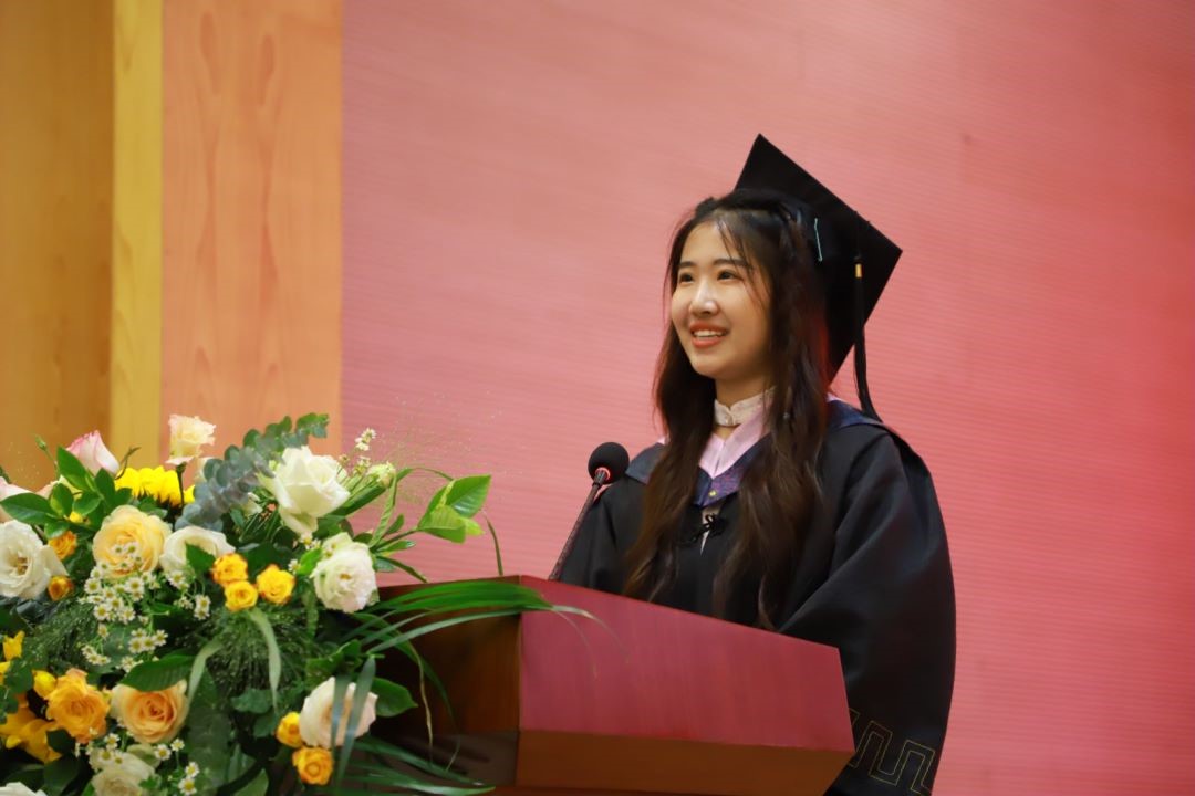 毕业研究生代表赵家宁在发言中感念重大之“大”,感谢母校为他提供了足够多的机会和平台,让他能够结识良师益友、拓展国际视野、厚积薄发。作为汉语国际教育专业毕业生,他通过两年在重大外院的学习和生活,更加坚定了“讲好中国故事,传递中国声音”的信念与决心。同时,赵家宁勉励同学们“道阻且长,行则将至。永远赤诚,永远做炬火,永远做心怀家国、不负使命的重大外院人”。