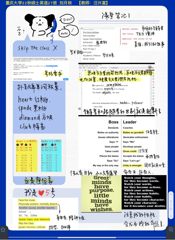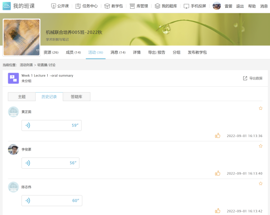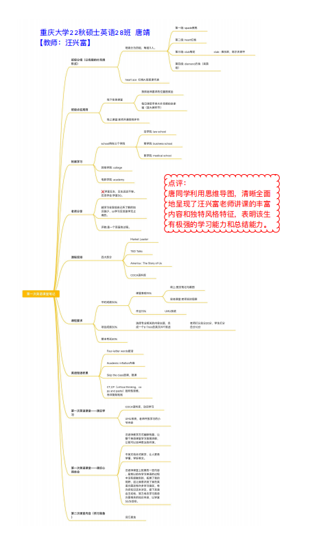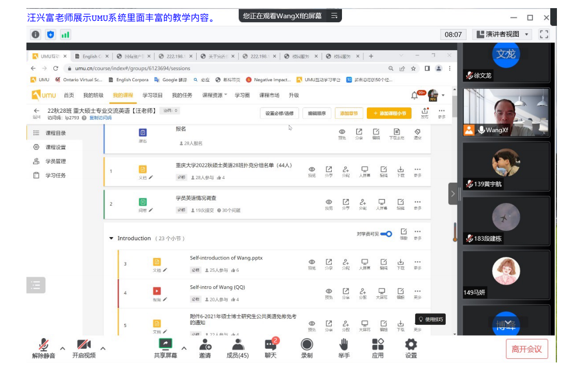 公外研究生专业交流英语课程教学中,汪兴富老师利用优秀的UMU教学平台,将Market Leader中高级教材、优秀的TED演讲、纪录片America: the Story of Us、以及COCA语料库资源4大主要内容整合成200多个学习小节或资源微课,以问卷、文档、视频、拍照、讨论、图文、作业、考试等多种类型编制出一个系统性的课程。上课采取间插拓展方式训练学生的语言能力,全面培养懂Communication,Cultures,Collaboration,Creativity,和Critical Thinking的5C能力的新时代研究生。并充分利用UMU平台积分规则调动学生学习积极性,向优秀同学学习。该课程的安排计划明确,课时的任务清晰明了,考核方式多元化,充分兼顾学生平时学习情况与最终考核成绩。