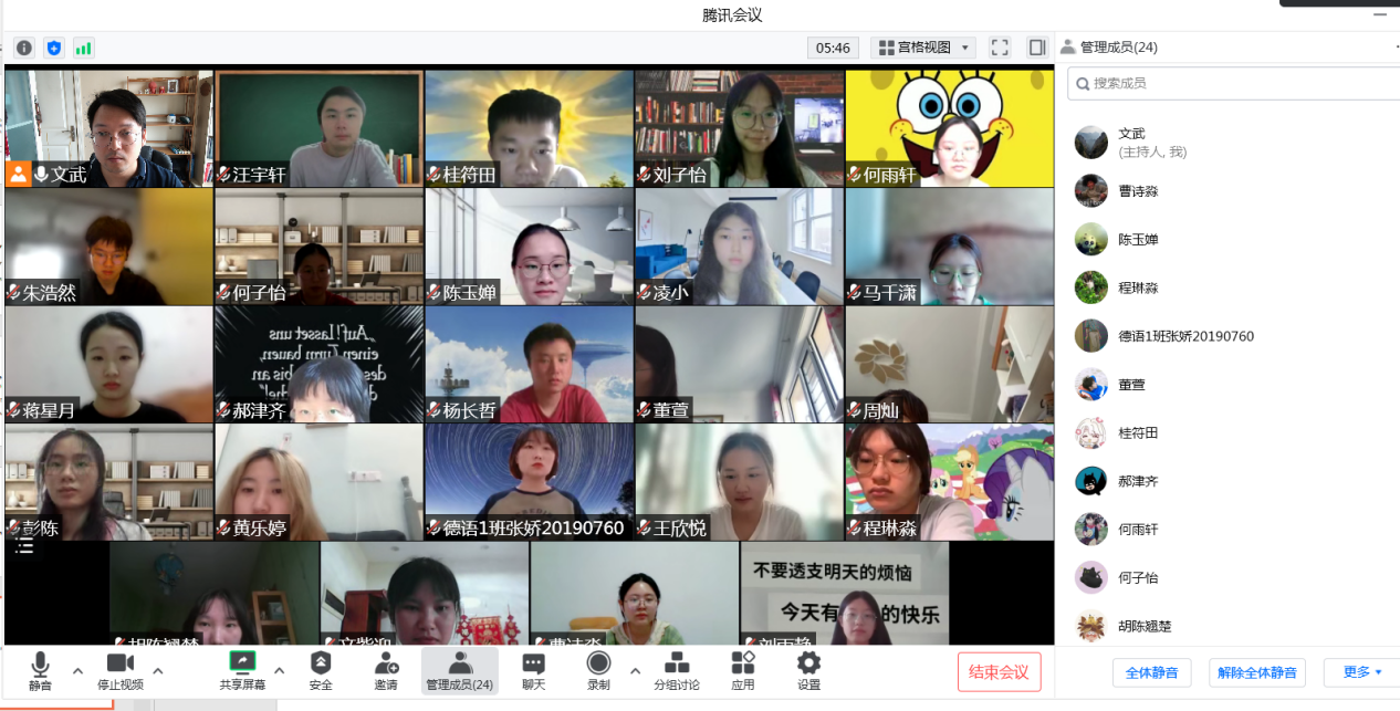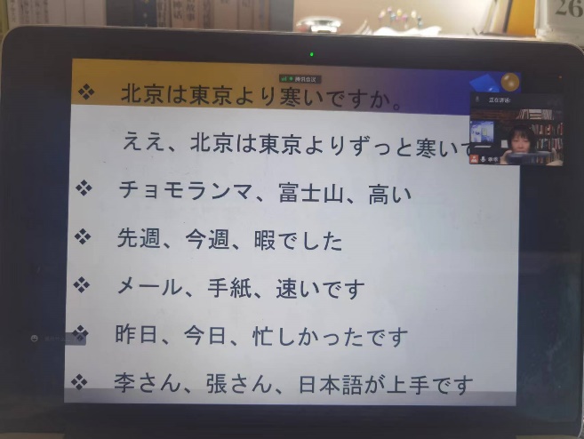 日语系马颖瑞老师在讲授基础日语(3)时采用线上直播,使用腾讯会议、qq群课堂等多种方式,并根据网络情况切换不同平台。讲解该课程语法时会结合时事新闻报道,导入思政元素,拓展课外词汇,让学生学会用所学词汇和语法去表述中国故事。马颖瑞老师创建云班课班级,发布学习资源,讨论和头脑风暴等活动,能够起到调动学生课下学习的积极性的作用。
