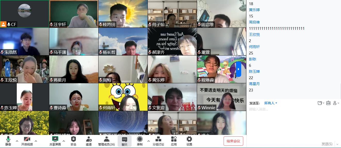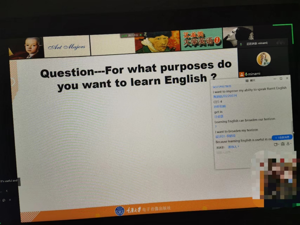 9月7日,大学英语艺体课程组学业素养英语初阶(1)课程正式开课,通过腾讯会议等平台展开线上教学。课程组教师在新生第一课上,通过问答、讨论等多种形式做好新生心理疏导,迅速破冰,激发学生的学习积极性。欧玲老师在云课堂中组织学生讨论重庆山火话题,紧跟时事,在英语教学的同时进行课程思政教学。