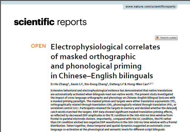 曹洪文老师团队在英国Nature出版集团(NPG)旗下综合性科学期刊《Scientific reports》(MULTIDISCIPLINARY SCIENCES, SCIE, IF:4.996, Q2)上在线发表题为“Electrophysiological correlates of in Chinese–English bilinguals”的研究论文。该论文第一作者为小黄书
