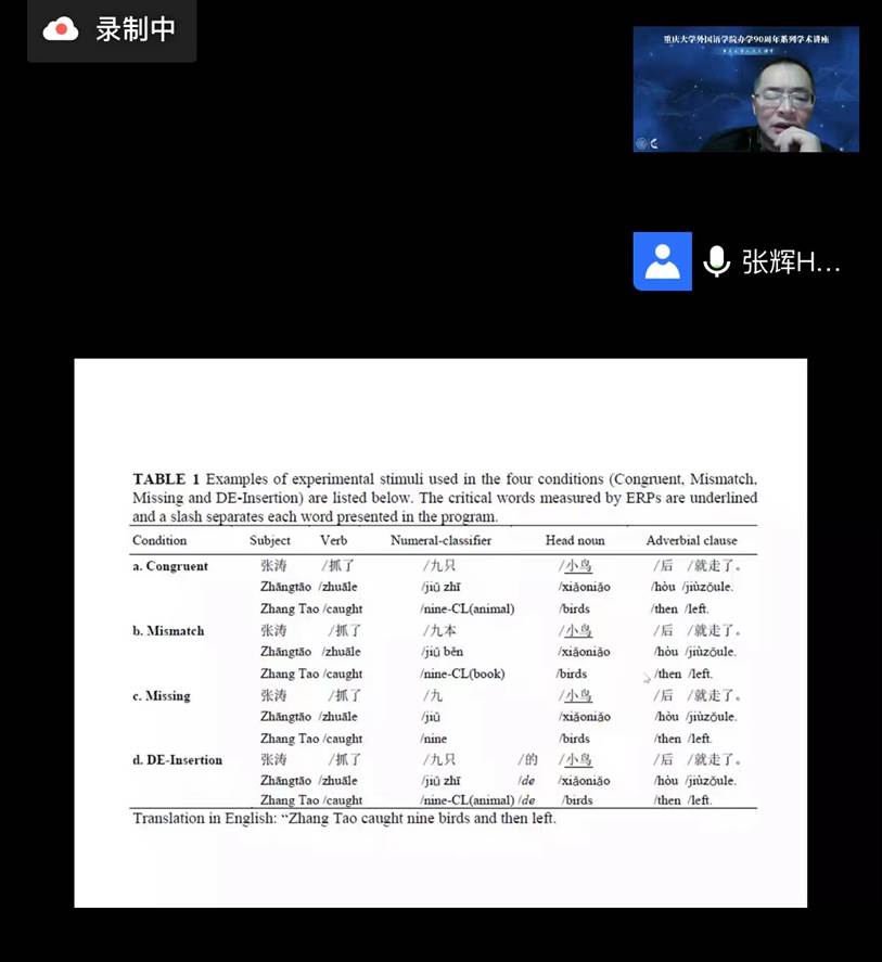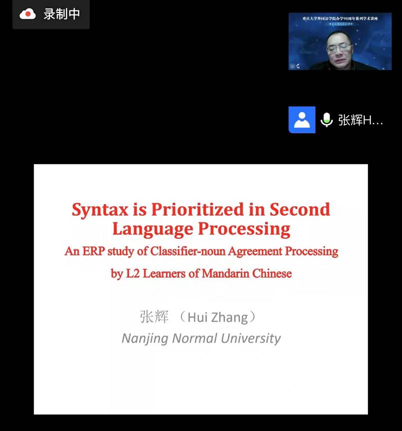 办学90周年系列学术讲座继续如期在线上举行。本场讲座的主题为《二语加工中的句法优先:汉语耳语学习者‘量名一致’加工的事件相关电位研究》。主讲人张辉教授系南师大博导,江苏省外国语言学学会常务副会长,湖北楚天学者讲座教授,中国英汉语比较研究会认知语言学专业秘书长兼副会长,中国英汉语比较研究会心里语言委员会副会长,中国语文现代化学会神经语言学专业委员会副会长等。国家社科基金学科规划评审专家,并主持5项国家社会科学和自然科学基金项目,其中两项为国社重点项目,出版学术著作10部,国内外发表论文100余篇。张教授为讲座涉及领域的资深专家,为小黄书