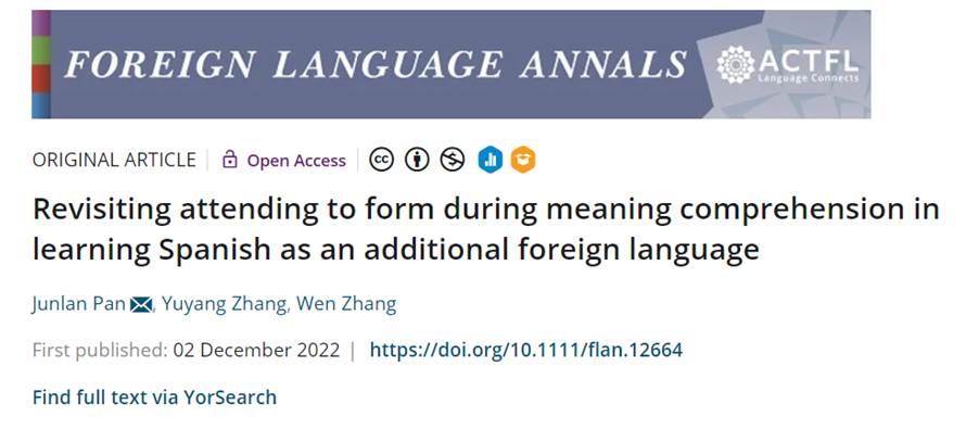 为第一通讯单位。该论文获英国约克大学开放论文出版资助,可开放阅读和免费下载(//doi.org/10.1111/flan.12664)。研究使用的实验材料和实验数据均已上传IRIS语言研究方法资源库,获得了“开放材料”和“开放数据”两项开放科学徽章。此外,该研究的中、英文双语研究概要已被OASIS语言研究开放概要资源库收录。据Journal Citation Reports™2021显示,Foreign Language Annals为语言学类一区期刊,影响因子为2.976。