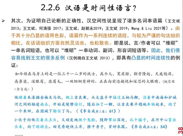 吴义诚教授随后针对汉语和英语是“空间性语言”还是“时间性语言”的相关学说进行了介绍,然后通过大量的语料和论证过程来进行了进一步的论证,指出了之前的学者提倡汉语是“空间性”这一学断里存在的问题。
