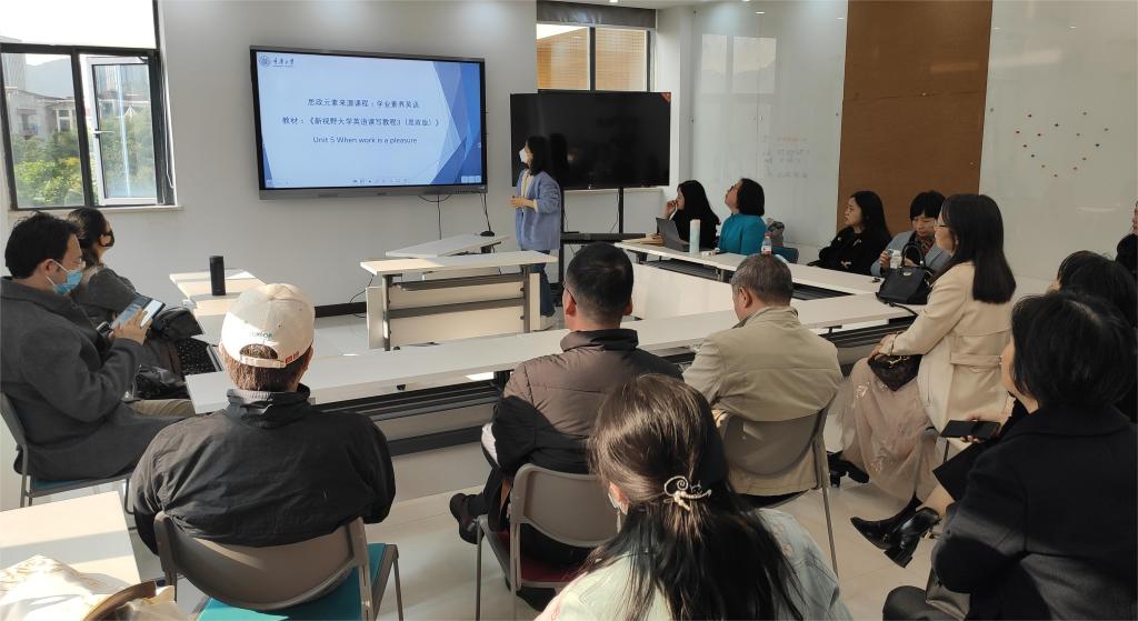 课程组严丹丹老师从教材出发,以《新视野大学英语第三册》第三单元为例,对中西方文明之人文关怀加以比较认知,解释中国人的文化认同,提升学生的人文关怀素养,并深度挖掘教材中的思政元素,将对学生的价值塑造和引领润物无声,融入教材的学习中。周翎老师以《新视野大学英语第三册》第五单元为例,引导学生思考不同工作态度的成因、影响,帮助学生树立自己的工作态度,并吸引学生深入进行自我反思,树立积极向上的工作观,将教材中的思政元素与课程学习结合,让新时代的大学生学会将日常生活与职业规划相结合,以达到将来在工作中实现价值感的目标,为祖国建设添砖加瓦。刘琳老师以《新视野大学英语第三册第二单元》为例分享课程思政设计。她以战胜恐惧为单元主题的学习为例,结合当代大学生正面临的自己当下生活和学习中的不适应和挑战,鼓励学生们树立社会主义核心价值观,在传统语言教学的基础上,融入思政元素,引领学生健康成长。刘世平老师分享了如何借助文本分析工具等技术讲好大学英语教学中的“中国故事”。他认为,选用的语言材料要融入中国故事、突出中国成就。陈晓莉老师以中美文化对比为视角,挖掘外语教学中的文化思政元素。