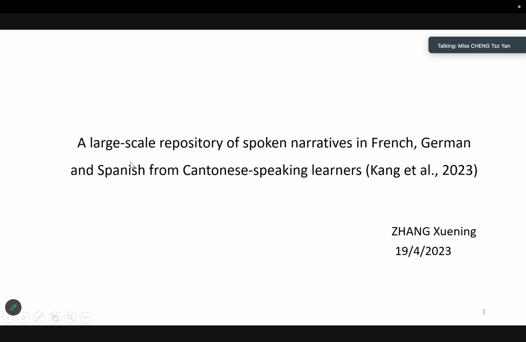 组会伊始,麦子茵博士向康鑫教授的到来表示欢迎,双方团队互相介绍各自研究方向和正在进行的工作。随后,麦子茵博士课题组的博士生张雪宁和研究助理聂嘉淇先后展示了康鑫教授近期发表的两篇期刊文章,分别是“A large-scale repository of spoken narratives in French, German and Spanish from Cantonese-speaking learners”和“Contributions of common genetic variants to specific languages and to when a language is learned”。