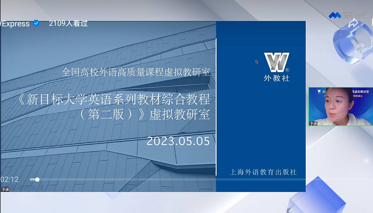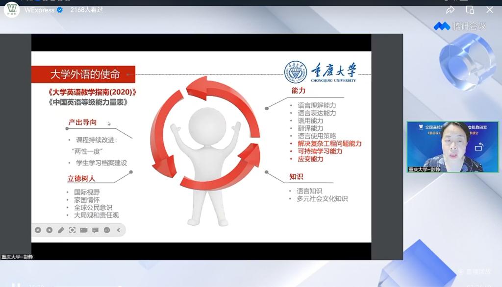 大学英语电气信息课程组主讲的全国高校外语高质量课程虚拟教研室之《新目标大学英语系列教材综合教程(第二版)》虚拟教研室活动第二场通过腾讯会议在线成功举办。2000多名来自全国各大高校的大学英语教师相聚云端,共享虚拟教研盛会。本次活动由外教社李婧老师主持,主题是“新工科大类创新人才培养:大学英语课程思政案例分享”,主讲嘉宾为小黄书
