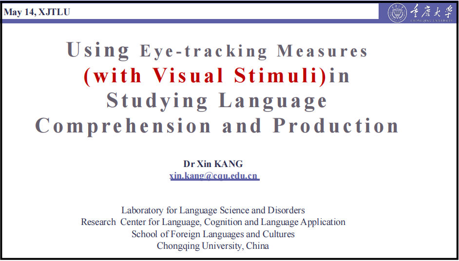 眼动追踪技术已广泛应用于心理语言学。在本次学术讲座中,康鑫教授首先介绍了眼动行为测量在语言理解和语言产出等一系列科学研究中的应用。随后,康鑫教授以自己发表的研究和正在进行的科研项目为例,重点介绍了自己主持/参与的三个方面的研究: 1)语言处理中的物体状态的心理表征,2)自然叙述话语的产出,3)快速自动命名任务。这些实验的参与者包括以英语和中文为母语的人士、非英语母语人士以及自闭症谱系障碍人士。