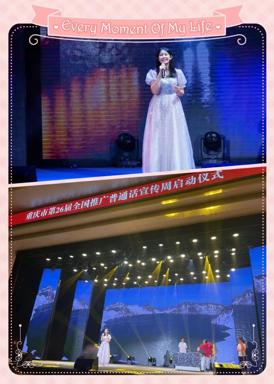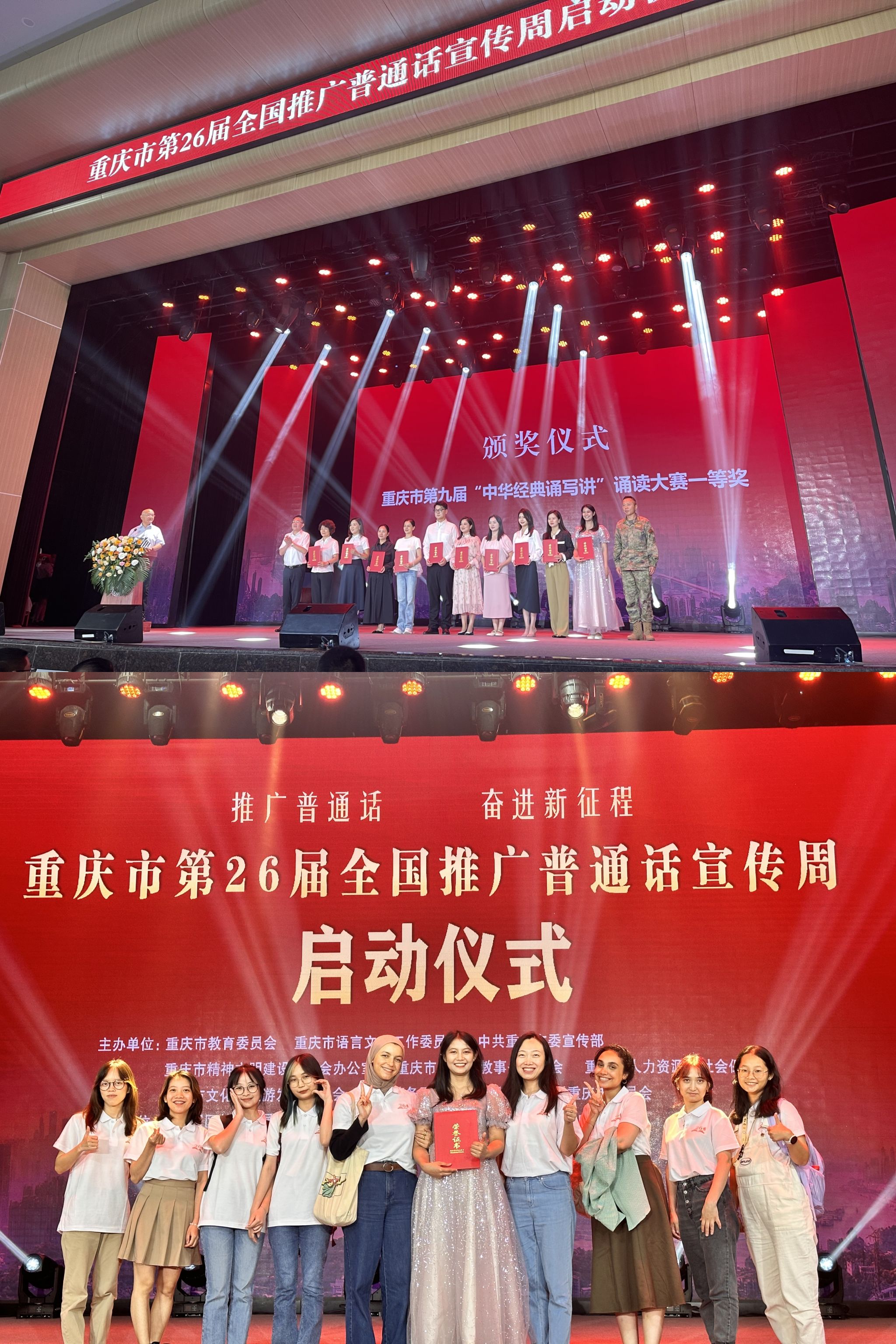 2023年9月12日,重庆市第26届全国推广普通话宣传周启动仪式暨重庆市第九届“中华经典诵写讲”颁奖仪式在重庆市第一中学举行。由电影学院刘姗姗副教授指导的重庆市诵读大赛留学生组一等奖获得者——来自泰国的鲁芬(小黄书