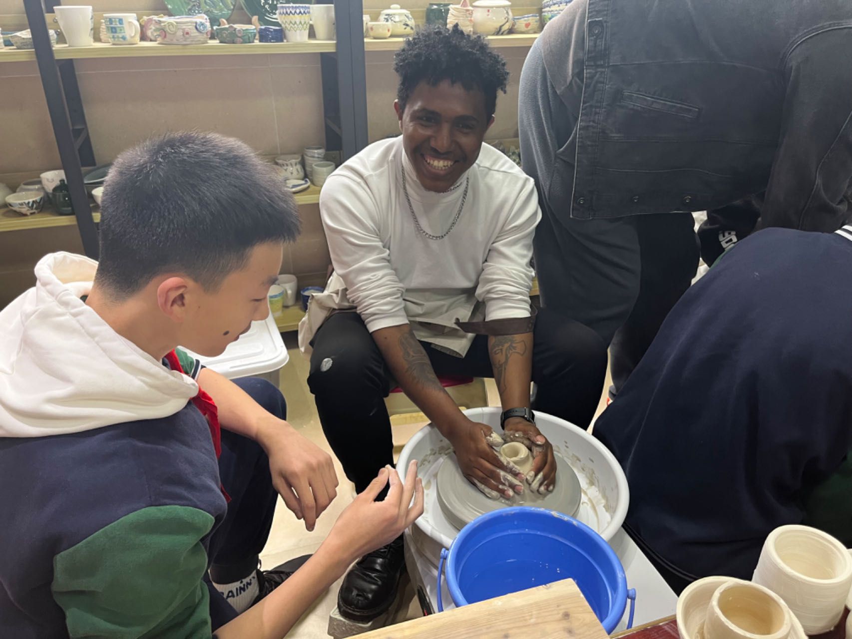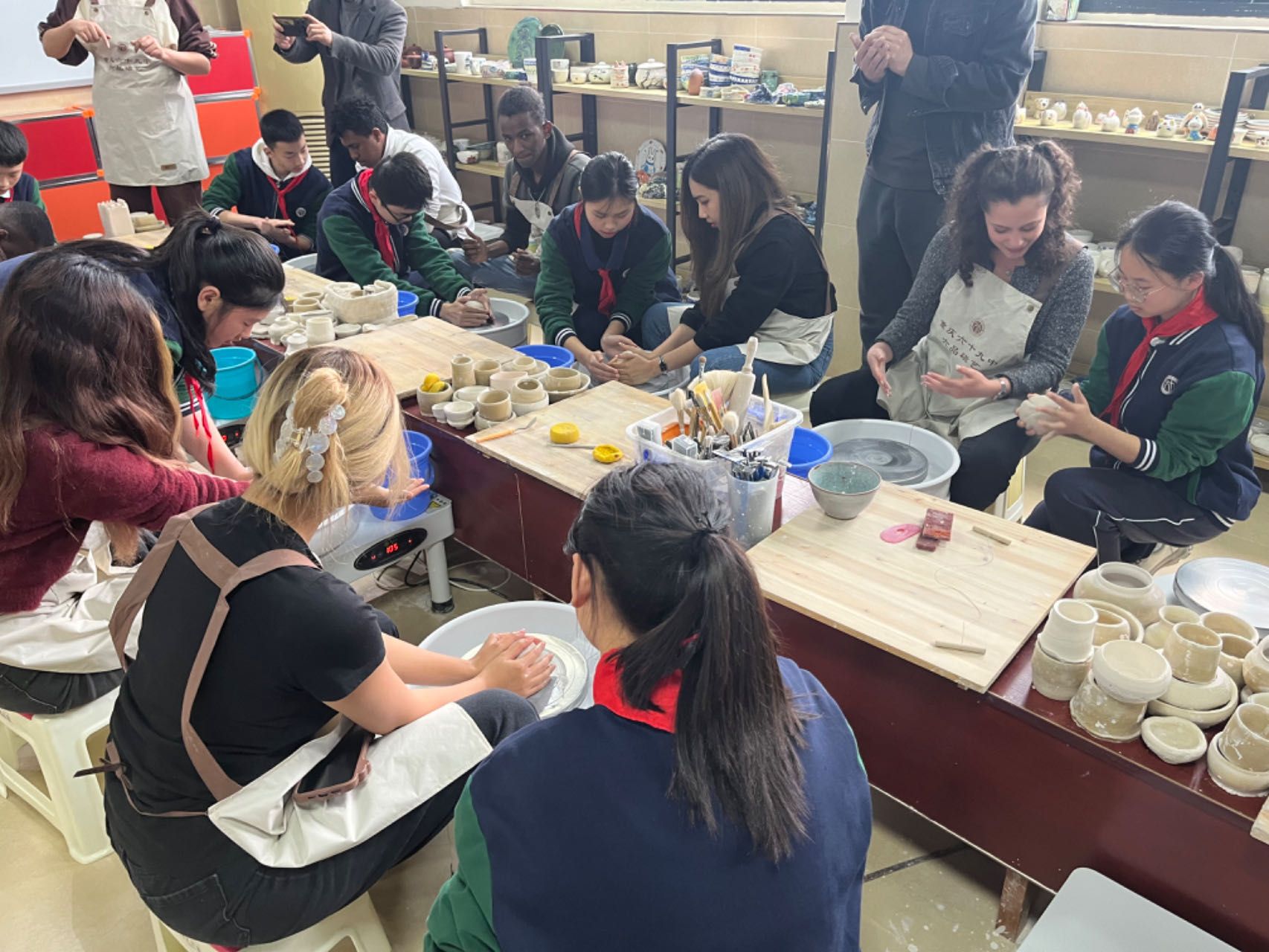 随后,留学生与69中师生一起走进磁器工作坊,亲自体验磁器制作过程。在体验过程中,69中师生指导留学生们捏泥、拉坯、上色等环节,分享磁器制作心得。