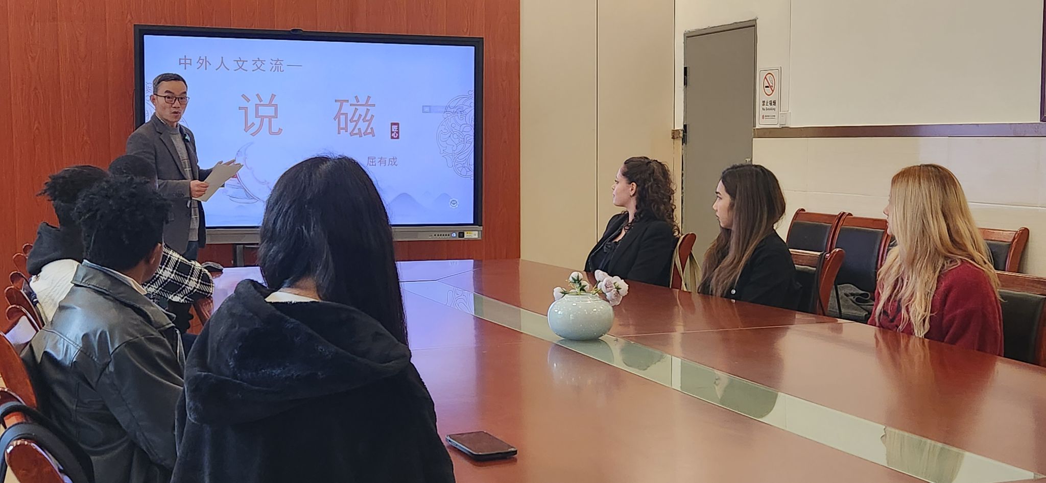 在活动开始,学校党支部书记、校长屈有成以“说磁”为题向留学生们介绍了中国和重庆磁器历史、古丝绸之路、学校磁器工作坊情况。留学生们认真倾听,充满好奇,对磁器产生了浓厚的兴趣。