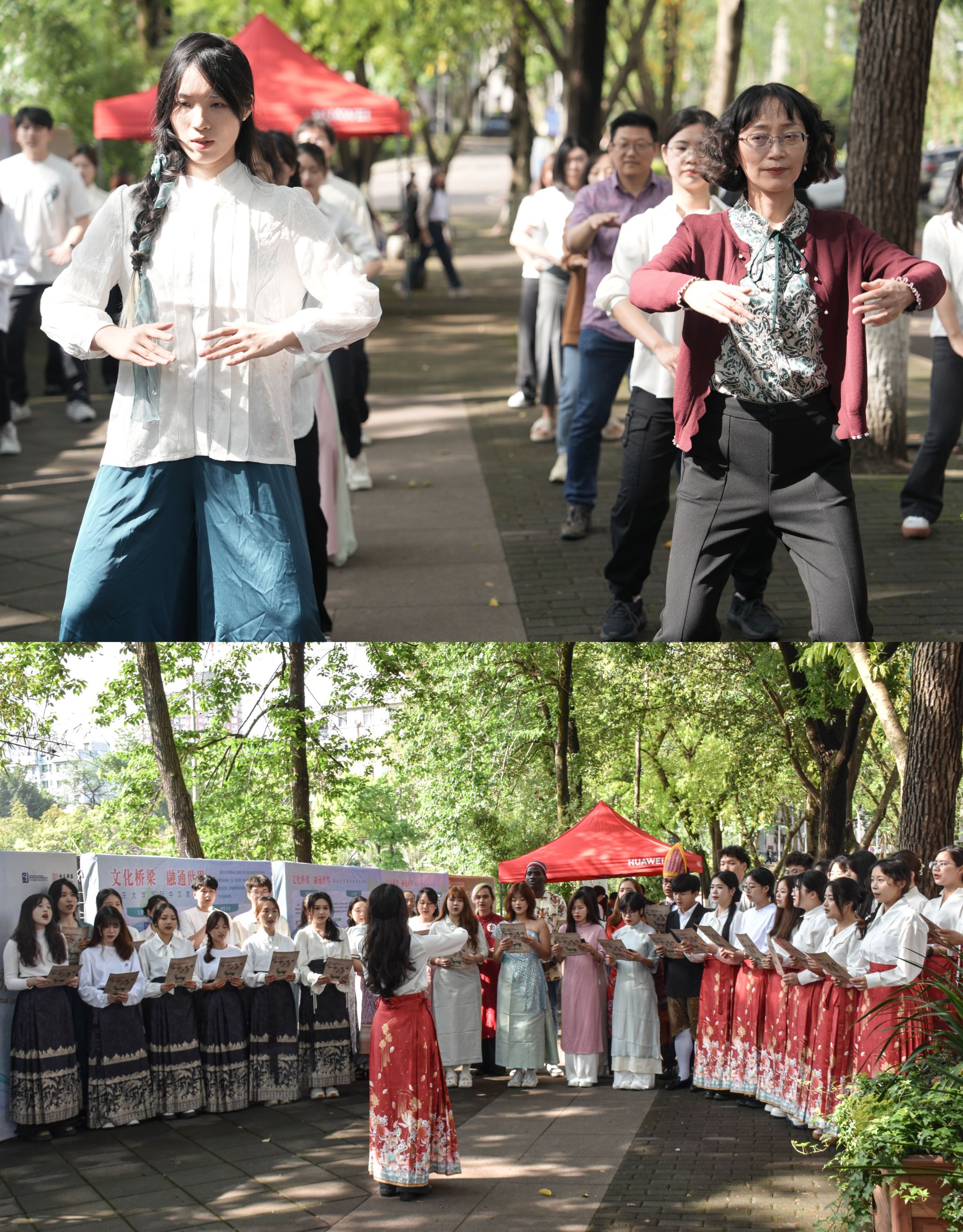 “国际中文日”——国际中文教育专业中外硕士生快闪活动,将现场氛围推向高潮,通过歌舞、朗诵、八段锦、剪纸、书法、簪花等形式展现了中外师生对中华文化的热爱。一曲充满古风韵味的《洛春赋》开场街舞,赢得了在场师生的阵阵喝彩。舞者们身着传统汉服,随着动感的音乐节奏,瞬间将观众带入古典艺术的世界。接着,中国学生身着传统马面裙,留学生穿着各具特色的民族服装,集体演唱并诵读了《诗经·小雅·鹿鸣》一诗,“我有嘉宾,鼓瑟吹笙”,体现了中国古代的待客之道和礼乐文化,展示了中国文化的优雅魅力。随后,一首欢快活泼的歌曲《上春山》,唱出了欢快明亮的少年气息。伴随着悠扬的音乐,在场观众纷纷下场,跟同学们一起打起了八段锦,将这一古老的中国健身艺术淋漓尽致地展现在舞台上。