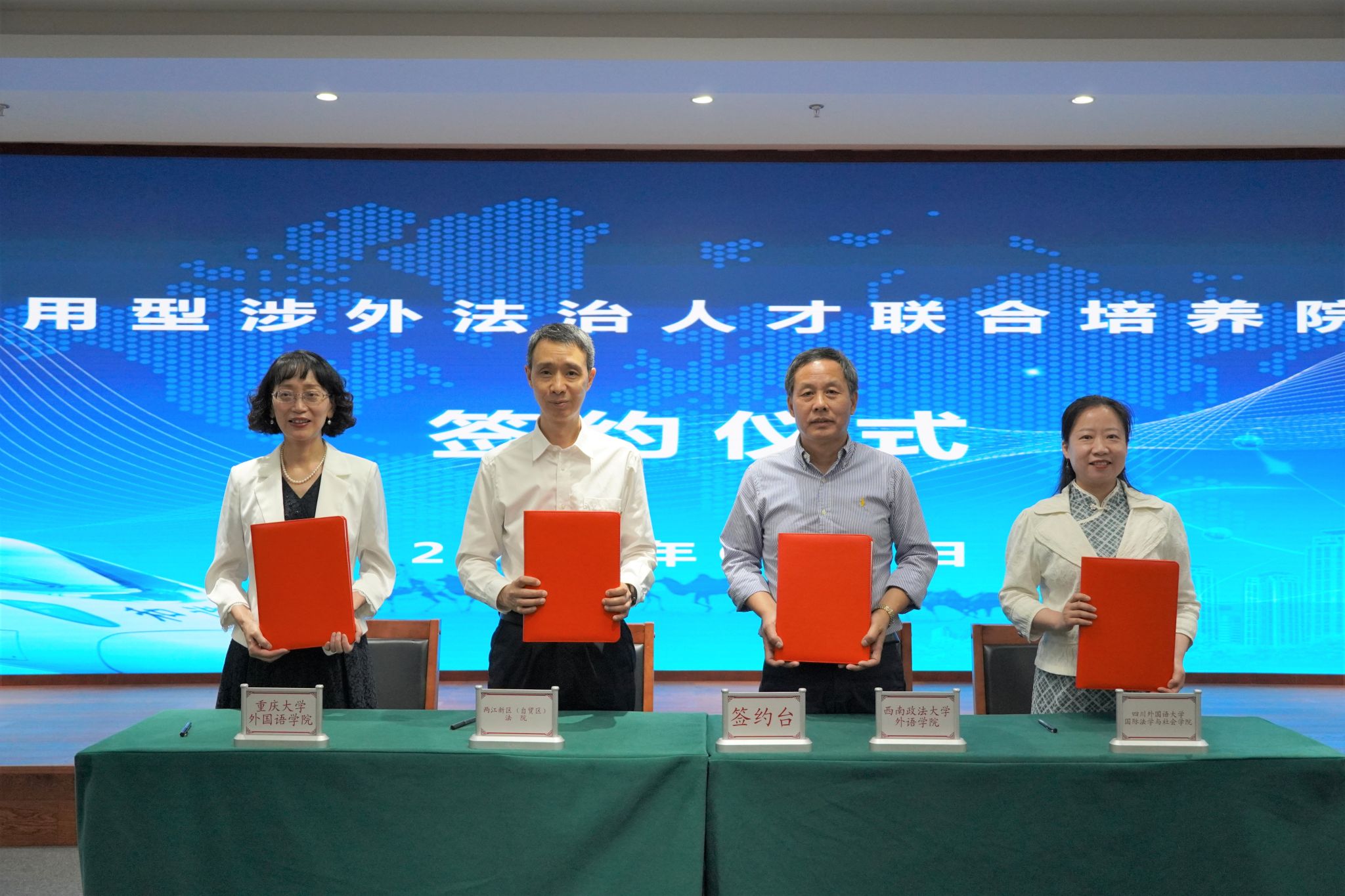 签约仪式上,与会四方共同签订了《高端应用型涉外法治人才培养院校合作项目框架协议》,约定充分发挥各自法律翻译的特长及优势,积极探索涉外法治司法实践与法学教育相融合的新路径,通过共同建设法律翻译等与涉外法治人才培养密切相关的职业技能训练课程等方式,共同推动高素质涉外法治人才培养,为“一带一路”共建、西部陆海新通道建设、重庆内陆开放高地建设贡献法治力量。