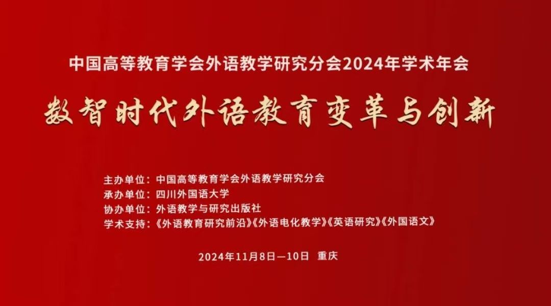 中国高等教育学会外语教学研究分会2024年学术年会于11月8日至10日在重庆丽苑维景国际大酒店成功举办。本次年会由中国高等教育学会外语教学研究分会主办,四川外国语大学承办,外语教学与研究出版社协办。年会主题为“数智时代外语教育变革与创新”,旨在深入探讨智能化技术如何推动教育治理、引领教育变革与创新。本次会议吸引了国内众多高校领导、外语院系负责人以及外语教育领域的专家学者,共同分享和讨论外语教育教学发展的新路径。