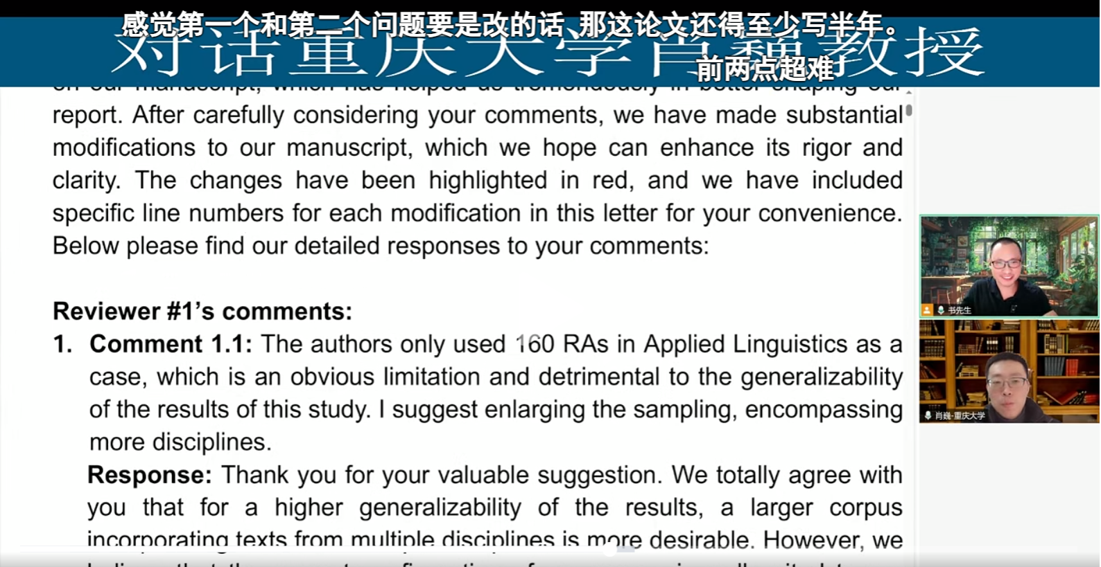 肖老师首先简单介绍了学术写作同行评议制度的特点,即:在学术圈,作者同时也是读者,研究者同时也是评判者;我们的文章会被别人审,同时我们也会审别人的文章。然后,肖老师分享了参与同行评议的几个好处:可以先睹为快,提前了解学术前沿;提升批判能力,帮助别人也帮助自己;体验开盲盒的乐趣,通过学习其他审稿人的意见发现自己的不足。肖老师号召青年教师如有机会积极参与审稿,以便从不同角度审视自己的文章;在读学生积极析出小论文投稿,以便获取反馈意见帮助自己提升毕业论文的质量。此后,肖老师分享了自己审稿的基本流程,并以自己参与审稿的一篇Lang Chen博士的文章为实例进行了审稿情景再现。作者Lang Chen博士与审稿人肖巍教授直接连线对话,将原始稿件、审稿意见及作者回复完全呈现在大家面前,就文章内容、审稿意见、作者如何回复进行了坦陈、充分的交流。最后,肖老师与Lang Chen博士就观众提出的问题进行了细致解答。此次讲座取得了圆满成功。