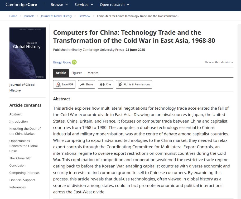 日语系讲师龚冰怡在全球史权威期刊《Journal of Global History》上发表题为“Computers for China: Technology Trade and the Transformation of the Cold War in East Asia, 1968-80”的学术论文。该期刊由英国剑桥大学出版社(Cambridge University Press)出版,系SSCI和A&HCI双检索期刊,位列JCR历史学类一区,在跨区域研究、全球史、世界史等领域具有重要的学术影响力。