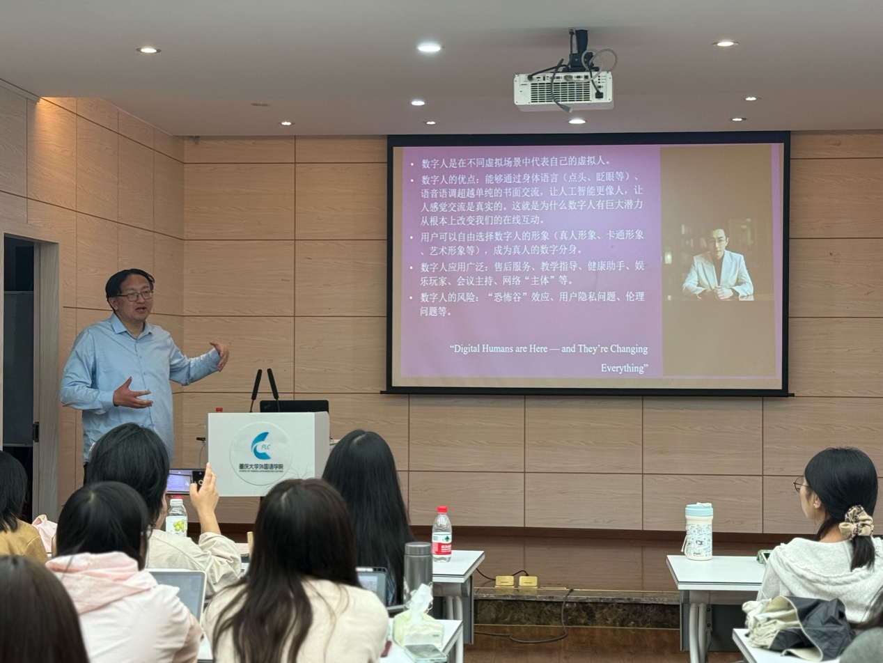 楼501会议室进行了题为“人工智能背景下的外语教学与研究:前沿与反思”的学术讲座。讲座由英语系奚茜博士主持,众多外院师生到场聆听。