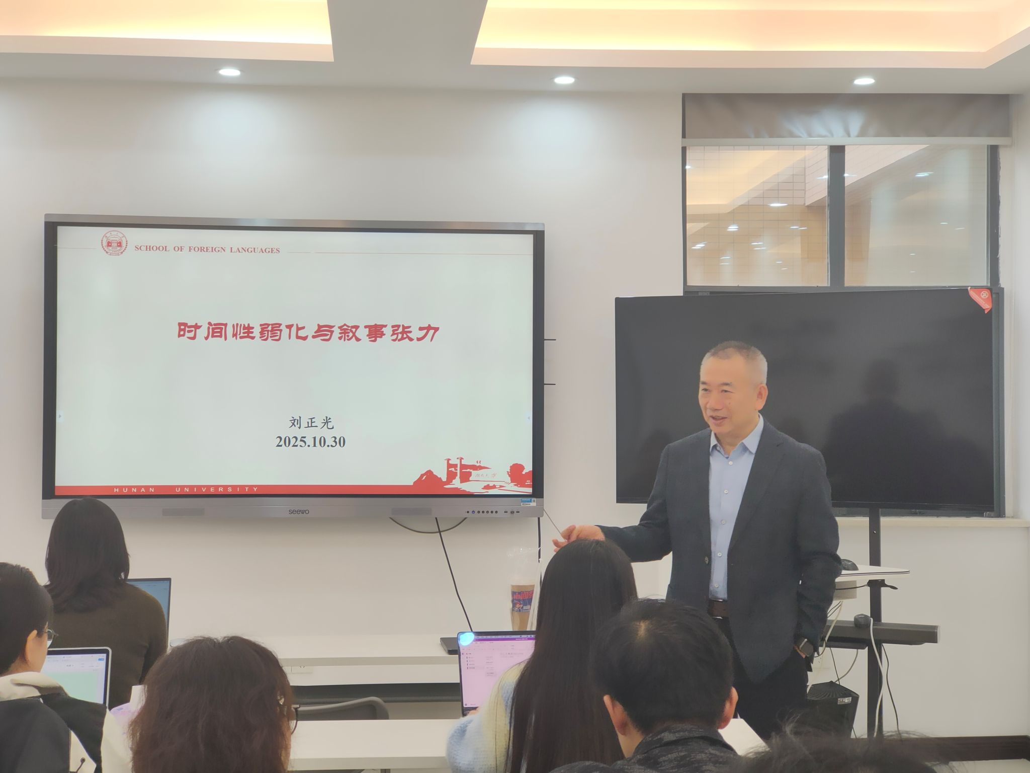 2025年10月30日上午,湖南大学刘正光教授应邀在UC联合学院楼422会议室作了主题为“时间性弱化与叙事张力”的学术讲座。报告由小黄书