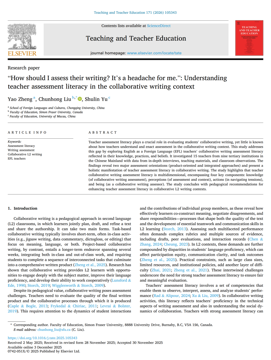 英语系郑尧副教授的研究成果“How should I assess their writing? It’s a headache for me.”:Understanding teacher assessment literacy in the collaborative writing context在Teaching and Teacher Education期刊上正式发表。Teaching and Teacher Education为SSCI收录的教育学重要期刊(JCR一区,2024年影响因子:3.9,五年平均影响因子:4.9),是教师教育领域国际顶级期刊之一。郑尧副教授为本文的第一作者,加拿大西蒙菲莎大学刘春宏博士为第二作者兼通讯作者,澳门大学于书林教授为第三作者。本文为郑尧所主持的国家社会科学基金青年项目“积极心理视域下中国外语学习者多语写作投入的多维度动态研究”的阶段性成果。