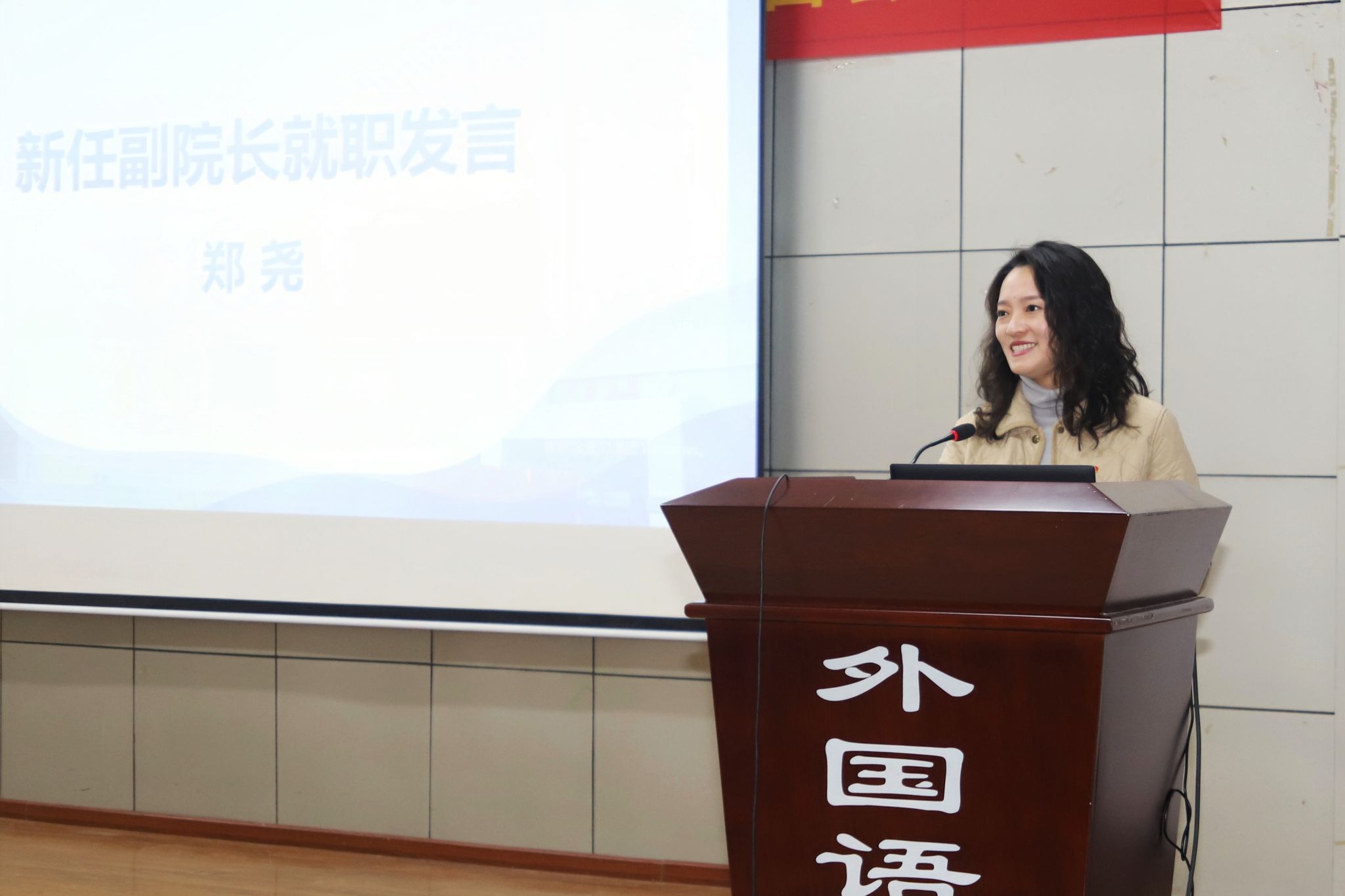 副院长。郑尧副院长在就职发言中回顾了自身研究方向与学院工作渊源,对组织培养和师生支持表示感谢,并以“四个新”畅谈履职感悟,表示将尽快熟悉新岗位工作,认真履职尽责,积极应对新挑战,期待在新文科建设背景下,与全院师生携手推进人才培养实现新突破。