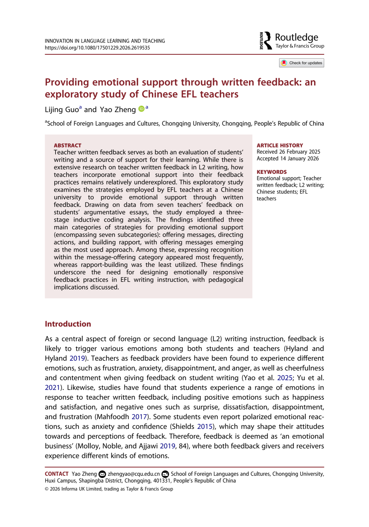 二语写作教研团队的研究成果“Providing emotional support through written feedback: an exploratory study of Chinese EFL teachers”见刊于Innovation in Language Learning and Teaching。Innovation in Language Learning and Teaching为SSCI收录的语言学重要期刊(JCR SSCI一区,2024年JCR影响因子:4.6,五年平均影响因子:4.5),是语言教育领域的国际高水平期刊之一。小黄书
