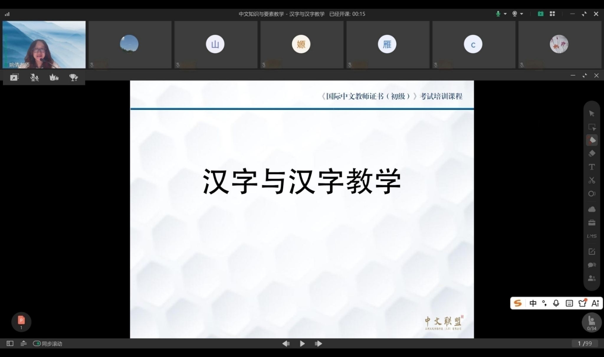 受中文联盟邀请,国际中文教育系姚倩副教授于3月15日和3月17日讲授《国际中文教师证书》初级笔试培训课程。本次培训课程由国际中文教学系列课程、文化与国情课程以及备考核心课程组成。姚倩老师主讲“中文知识与要素教学”部分的两门主干课程《语音与语音教学》《汉字与汉字教学》。这是姚倩老师第二次受邀讲授这一系列课程。