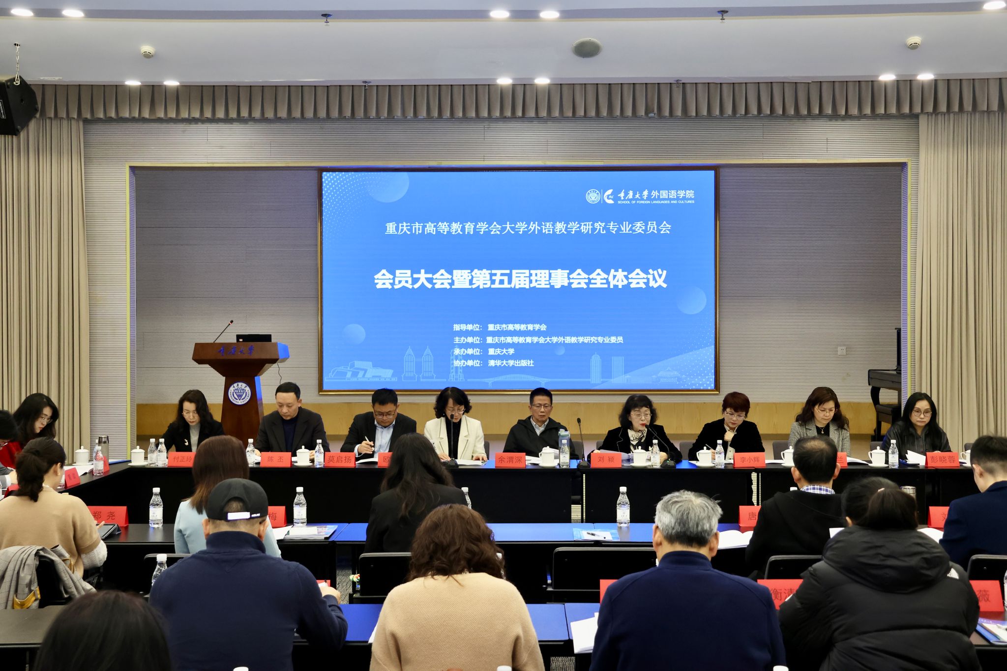 会上,刘颖副秘书长代表学会致辞,并宣读换届批复文件。她充分肯定第五届理事会在国际化人才培养、深化大学外语教学改革、促进教师专业发展等方面的显著成效,并特别感谢余渭深教授二十余年对大学外语教学研究专业委员会和重庆市大学外语教育的创新引领,同时勉励新一届理事会继续聚焦高质量发展,服务重庆高水平对外开放战略,为提升重庆国际竞争力贡献外语教育力量。