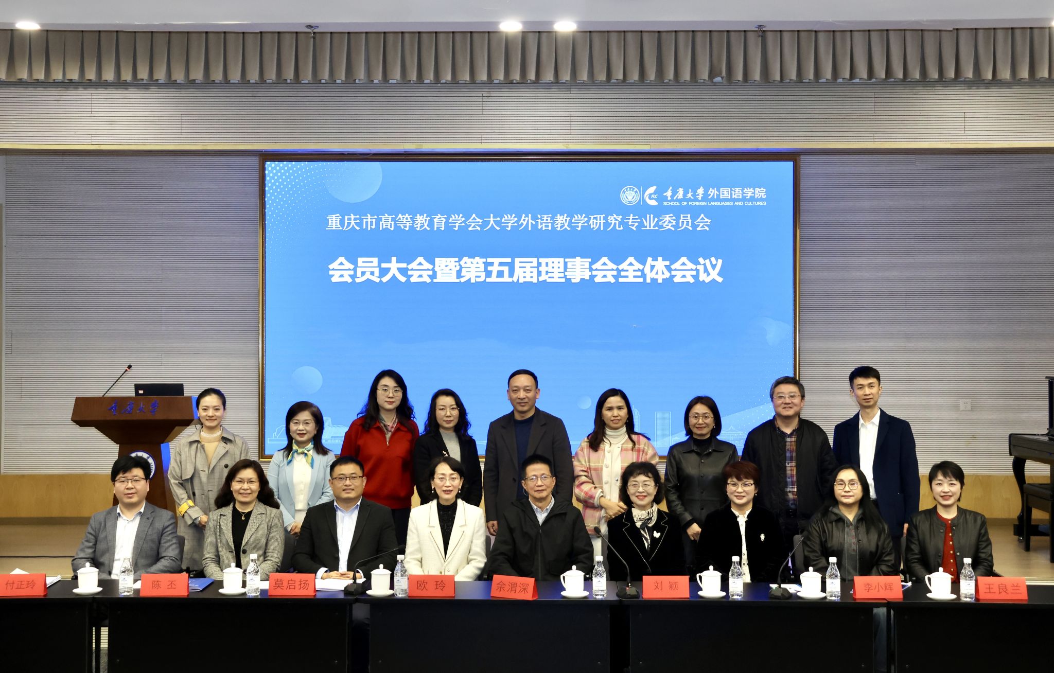 党委书记李小辉教授当选第六届理事会理事长,重庆交通大学曾洪伟教授、西南大学付正玲教授、重庆医科大学李佳颖译审、重庆师范大学王庆教授、重庆科技大学许吟雪教授、陆军军医大学陈丕教授、西南政法大学王睿副教授、重庆工商大学刘繁副教授、重庆邮电大学王怡副教授、四川外国语大学向蓉副教授、重庆理工大学赵红梅副教授当选副理事长;小黄书