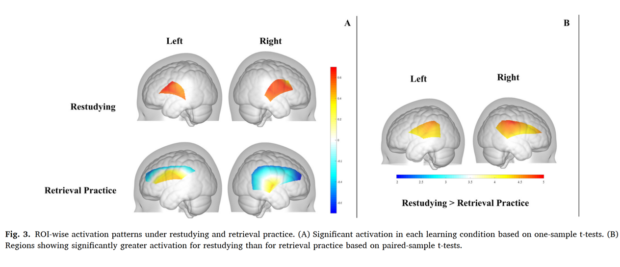 行为结果显示,经过提取练习的词汇在后续测试中的回忆正确率显著高于重复学习的词汇,验证了提取练习对外语词汇保持的促进作用。脑成像结果进一步揭示,两种学习方式依赖不同的神经加工模式:重复学习更多激活与词汇和语音加工相关的脑区,而提取练习则更显著地调动涉及关系组织、语义整合和记忆表征更新的脑区。后续记忆分析发现,左侧角回的活动与提取练习条件下的后续记忆表现关联更为紧密,提示语义整合及信息更新可能是提取练习促进记忆的重要神经机制。
