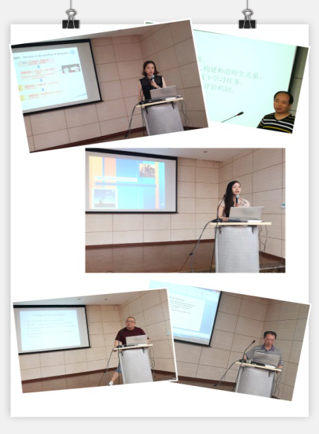继5月31日举行拓展语言类(2-3级)课程组的第二轮公开教研活动,本次教研活动主要由拓展语言类(1级)的5个课程组分享他们的教学实践和反思。蔡以强老师首先分享了《主题英语写作》教学中如何结合读写进行基于理解性输入的有效输出、如何通过过程写作和对比分析培养学生英语写作的良好思维习惯和写作习惯。雷蕾(小)老师展示了多模态视域下的《大学英语陈述与沟通》翻转课堂教学模式设计,该课程团队基于对学生的需求分析,最大限度地挖掘学生潜力,在教学中注重教师示范,强调与学生专业兴趣相结合。陈渝老师则代表《主题英语阅读》课程组分析了《中国英语能力等级量表》视角下如何培养学生以阅读为核心的语言综合技能、如何有效发展学生的思辨能力和自主学习能力。 谢玉老师分享了《商务英语阅读与写作》中的小组项目设计原则和教学案例,体现了项目学习中教师搭台、学生自主、合作学习、成果导向的特点。最后,刘世平老师向大家展示了《慢速英语听力》教学中结合线上线下学习、发展以听力为核心的语言综合技能的课堂教学设计。