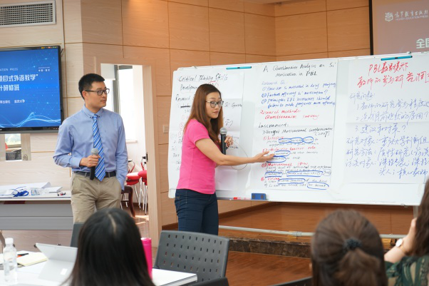 彭静院长、邹晓玲教授和北京外国语大学张虹博士的指导下,开始对自身教学活动中产生的研究兴趣点进行梳理,并在小组中选择一个主题作为本次研修班小组项目设计主题,在小组成员的共同协商下,结合本次研修内容,设计一个具有可操作性、实践性的基于PBL的教学研究方案,并在全班进行陈述和回答其他学员和专家们就这个设计提出的问题,从而进一步完善这个设计。