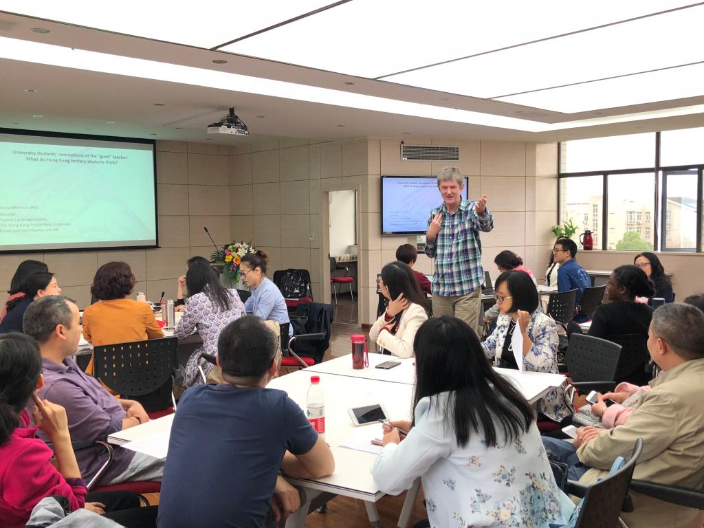 分别做了两场讲座。上午讲座主题为《大学学生眼中的“好”老师:香港大学生之所见》;下午讲座主题为《超越常规课堂的语言学习》。上午的讲座里,Morrison教授先梳理了从上个世纪四十年代至今相关研究文献中对“好老师”特质的描述, 尤其分析了中国学生对“好老师”的要求。接着跟在座老师分享了他在香港理工大学所做研究里,香港学生眼中的好老师的特征。Morrison教授还引导与座的教师们反思了在本土化环境中,我们认为的好教师标准;并尝试性的引发大家探讨了如何在教师自我发展里更多去关注学生在意的教师特质。在下午的讲座里,Morrison教授带领大家一起梳理了从十九世纪以来在语言教学领域里教学方法的发展变迁。然后对究竟什么是常规课程做了尝试性的界定及说明。下午讲座的核心部分是基于前两点而展开的对超越常规课程的语言学习的探讨及分享:包括对学习模式、学习工具、理论基础、发展趋势以及开展的形式的讨论与分析。