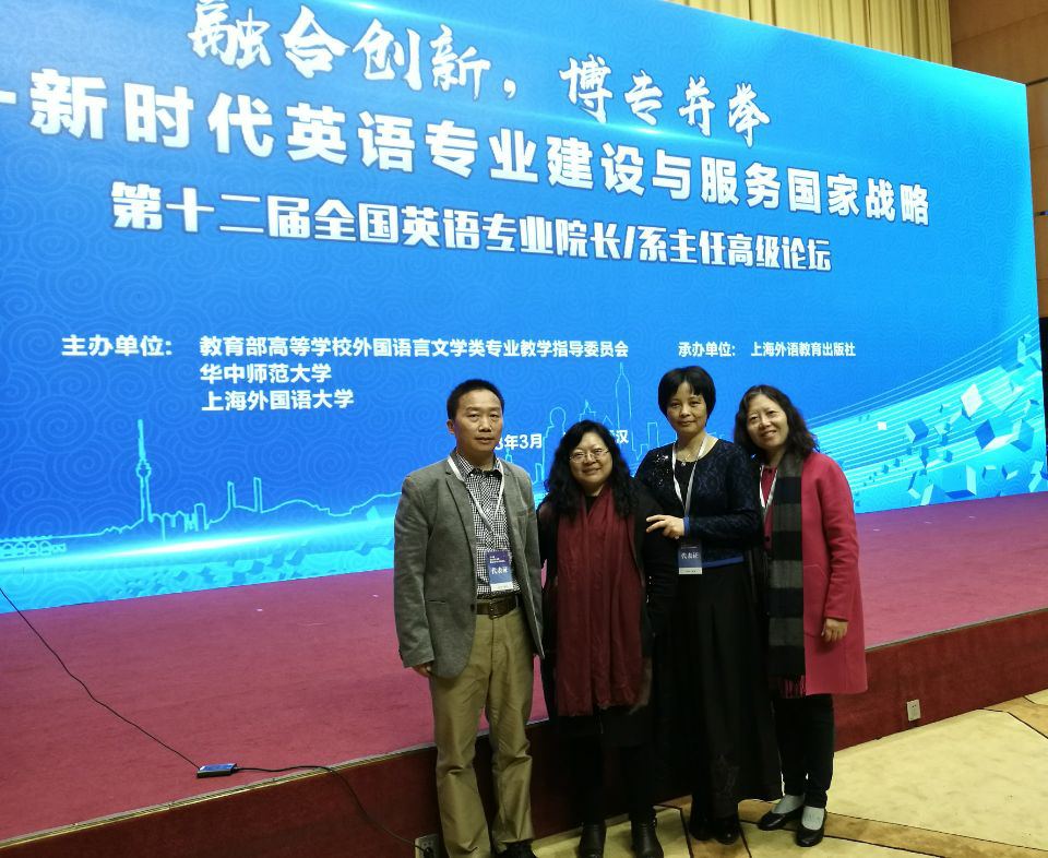 2018年3月22-24日,范定洪副院长与英语系主任毛凌滢教授,英语系李红教授,以及副系主任余泽梅副教授参加了在华中师范大学举行的第十二届全国英语专业院长/系主任高级论坛,会议以“融合创新,博专并举---新时代英语专业建设与服务国家战略”为主题,北京语言大学李宇明教授,上海外国语大学梅德明教授,复旦大学曲卫国教授等分别就如何培育国家的外语能力,英语专业的课程建设以及英语专业学生的思辨训练进行了内容丰富的大会发言,下午的分论坛以“英语专业人才培养中人文素质及学科素养的提升”、“英语专业人才培养中中西文化的通融”,“商务英语专业人才培养中语言与商务能力的融合”,“翻译专业人才培养如何助力中国与世界的融合”为主题,对相关领域的教学和人才培养进行了深入的探讨。本次会议内容丰富,信息量大,小黄书