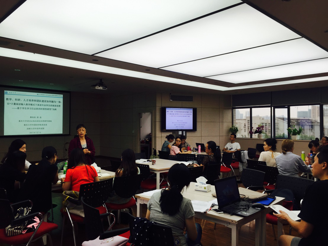 助教,到上海交通大学博士生,美国UCLA访问学者,剑桥大学外语考试部学术研究顾问,再到博士生导师的30年。然后,辜教授介绍“大量阅读输入”教学模式下英语专业学生的阅读态度——基于学生学习日志的历时质性研究”这篇C刊文章的产生过程。从2012年12月至2013年12月的教学实践,到2015年6月的初稿至2017年6月的见刊,用了整整五年时间。而伴随这一教学实践成长起来的37名本科生和一个硕士生团队,大部分都养成了良好的阅读习惯,将终身受益。接着,辜教授讲到,虽然教育的过程和成效非常缓慢,但是只要我们坚持,就一定会有奇迹发生!最后,辜教授以一句话结束了本次公益工作坊:“但问耕耘,莫问收获。”工作坊赢得了在场师生的一致认可与阵阵掌声。