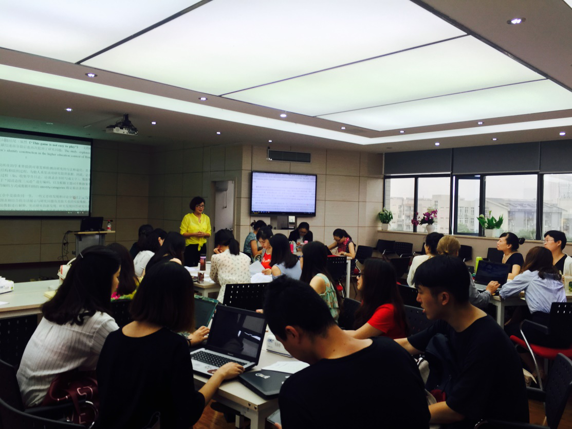 第一场的主题为“我们一起读文献”。首先,辜教授介绍:“上周五和周六我们刚刚请了北京外国语大学中国外语与教育研究中心张虹博士和香港教育大学袁睿博士给我们做了两天的‘外语教学与研究’工作坊。作为后续,我们将选取两位博士最近发表的文章各一篇,与大家一起研读,共同探讨期刊文献应该如何阅读的问题。”随后,辜教授现场带领师生一起阅读袁睿博士的“The game is not easy to play”以及文秋芳教授、张虹副教授的“倾听来自高校青年英语教师的心声”两篇文献。从摘要,到正文,再到参考文献,辜教授循循善诱,细致入微,耐心讲解。接着,在交流互动环节,在场老师和学生踊跃提问,与辜向东老师一起探讨“如何提高自己对文章的理解”、“新手型研究者如何阅读文献”、“阅读文献的重要性”等话题。大家一致认为,intensive and extensive reading很重要,看文献学东西很快,是一种很好地提高自己的方式。