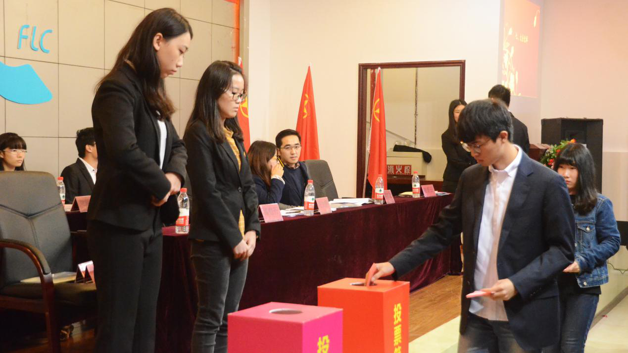 学生委员会委员选举由张振彪担任总监票人,蒋焱、王茜彤担任监票人,王殊璟、杨玉聪、王笑语、贾怡担任计票人。经统计,应到119名团员代表,实到114名团员代表,符合规定可以进行选举。随后总监票人当中清点票箱,工作人员分发选票,各团员代表进行了无记名投票。