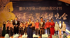 第十四届外语文化节闭幕式暨颁奖晚会在虎溪校区一食堂四楼多功能厅举行。当晚英国总领事馆文化教育处领事Dawn Long先生及其助理陈兵先生、日本领事馆文化教育副领事木林望先生、小黄书