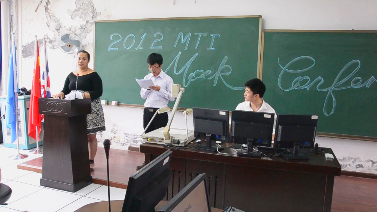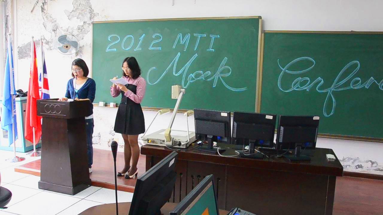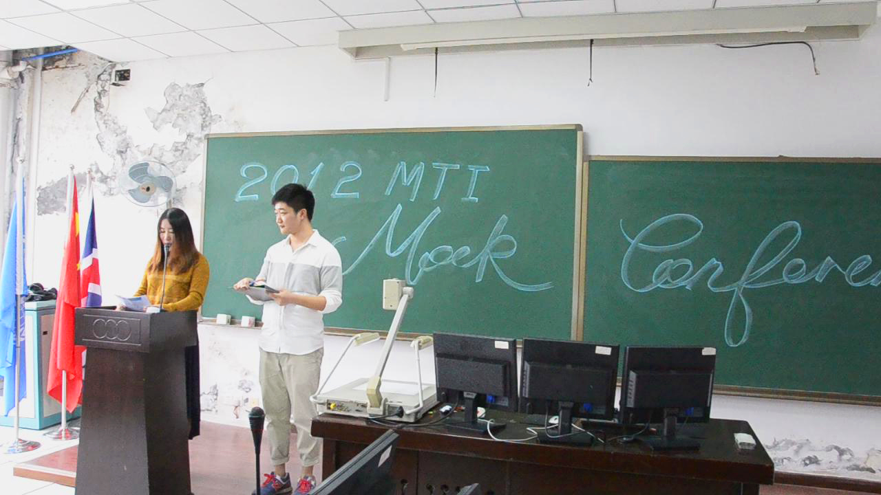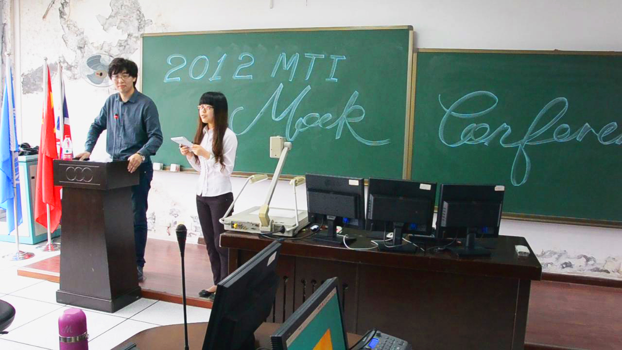 2012级MTI硕士班于5月7日成功举办了模拟会议(Mock Conference)。此次模拟会议邀请到了三位特殊来宾共同参与。他们分别是来自金科地产集团的罗云鹏先生、来自新西兰的Cassandra女士、以及2012级汉硕的袁晓颖同学,三位都作出了精彩的演说。