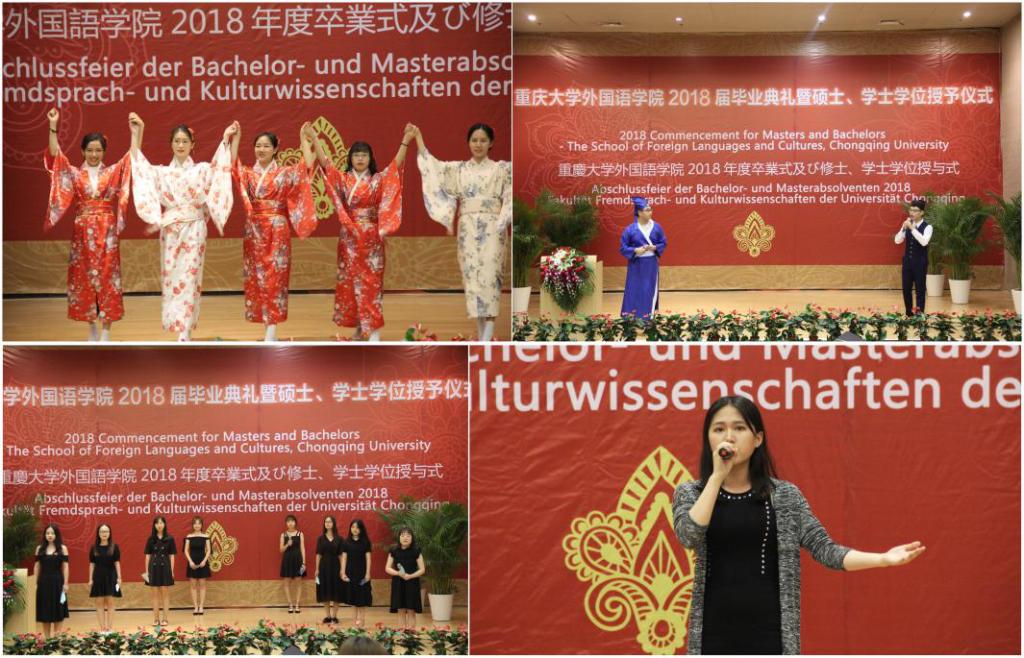 2018届本科毕业生和毕业研究生制作的满载回忆的毕业电子相册将师生的思绪拉回曾经最美好的时光。日语专业本科毕业生们以一曲时装舞蹈秀—东京盆舞开启了典礼。美丽的日式和服和富有节奏感的配乐,一下子将大家从离别的愁绪中抽离出来。大家纷纷随着日语系小姐姐们一起“摇摆”。英语3班的毕业生们以合唱的形式为大家带来两首歌舞串烧《房间》和《仰望星空》。在悦耳灵动的歌声中,毕业生纷纷畅想自己的未来。英语1班周宇翔和德语1班吴鹏宇演唱的《李白》将典礼的氛围推向高潮。