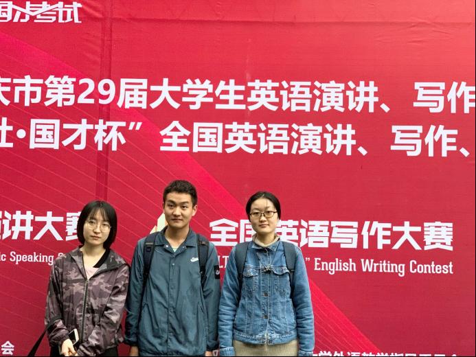 张菁淳同学、杜英杰同学、程芳同学在重庆市第29届大学生英语演讲、写作、阅读比赛暨2019“ 外研社·国才杯”全国英语阅读、写作、演讲大赛重庆赛区决赛中获得特等奖。此外,我校其他参赛学生还取得各项比赛一等奖3项、二等奖5项以及三等奖3项。本次大赛在重庆科技学院举行,重庆市共26所高校269选手参赛,包括英语专业本科、大学英语本科、英语专业研究生、非英语专业研究生等六个组别同台竞技。