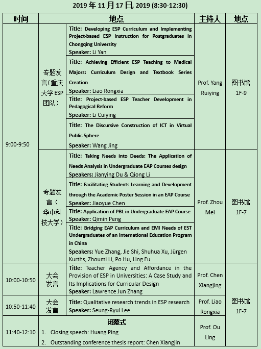 亚洲ESP学会第三届年会暨全国第八届专门用途英语研讨会会讯 (15-17 November 2019 Chongqing University, China)