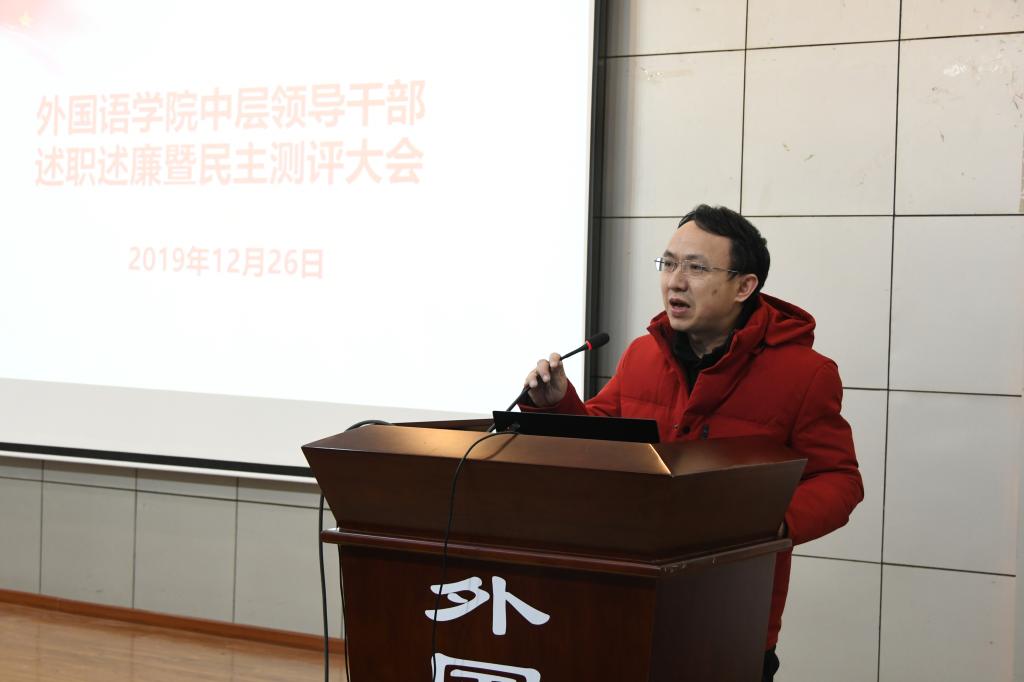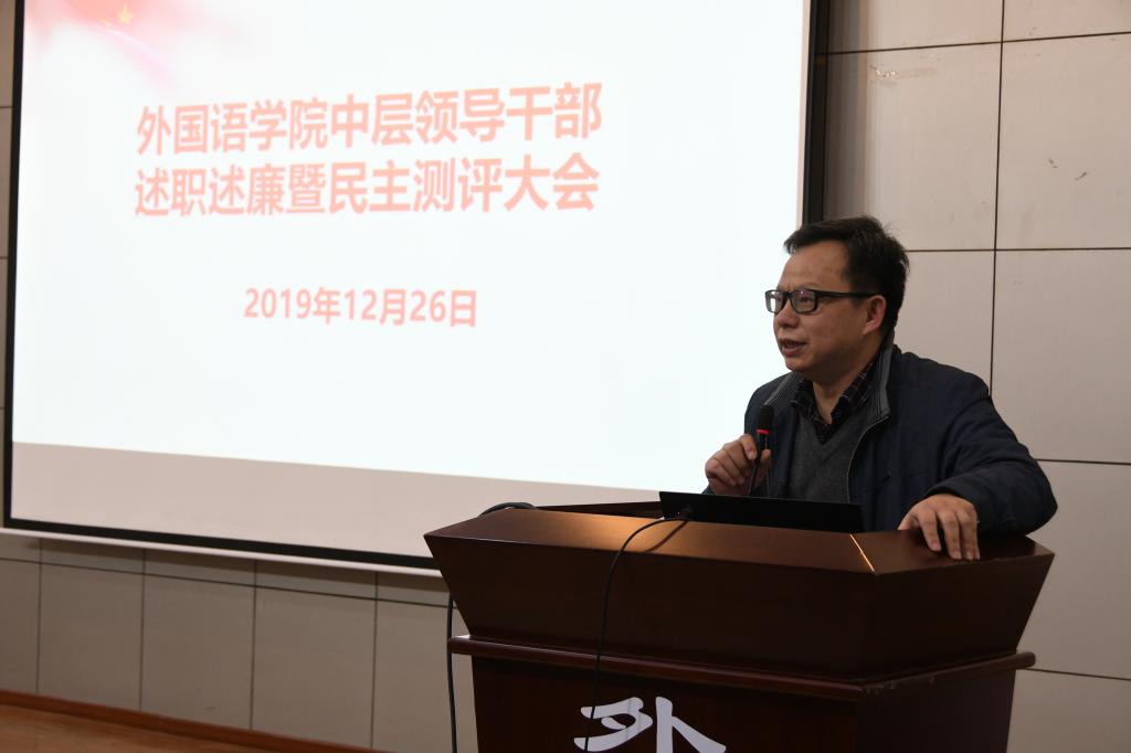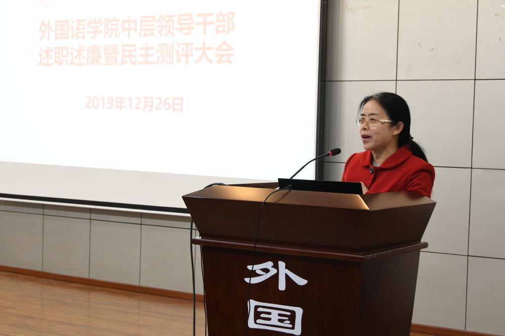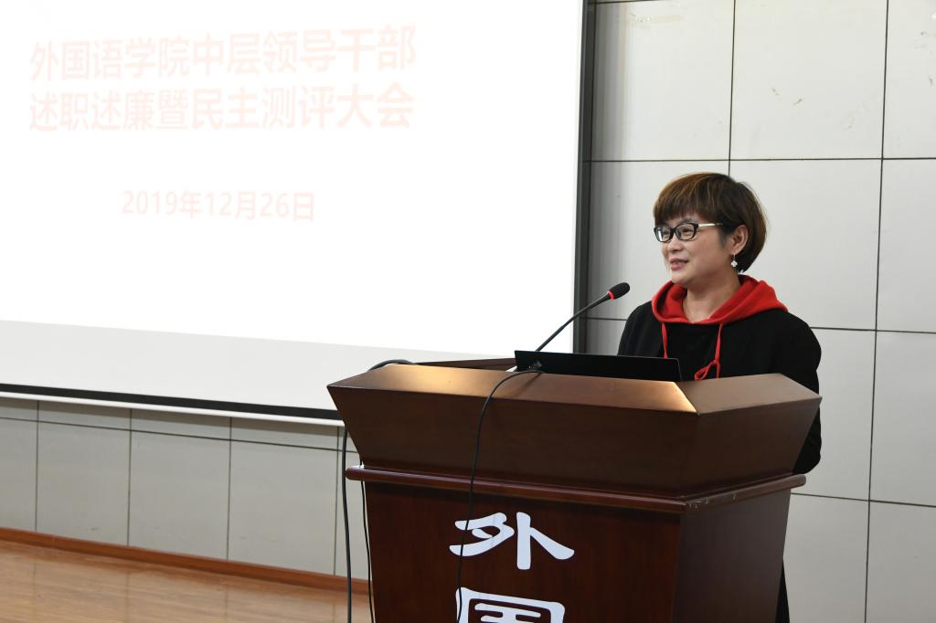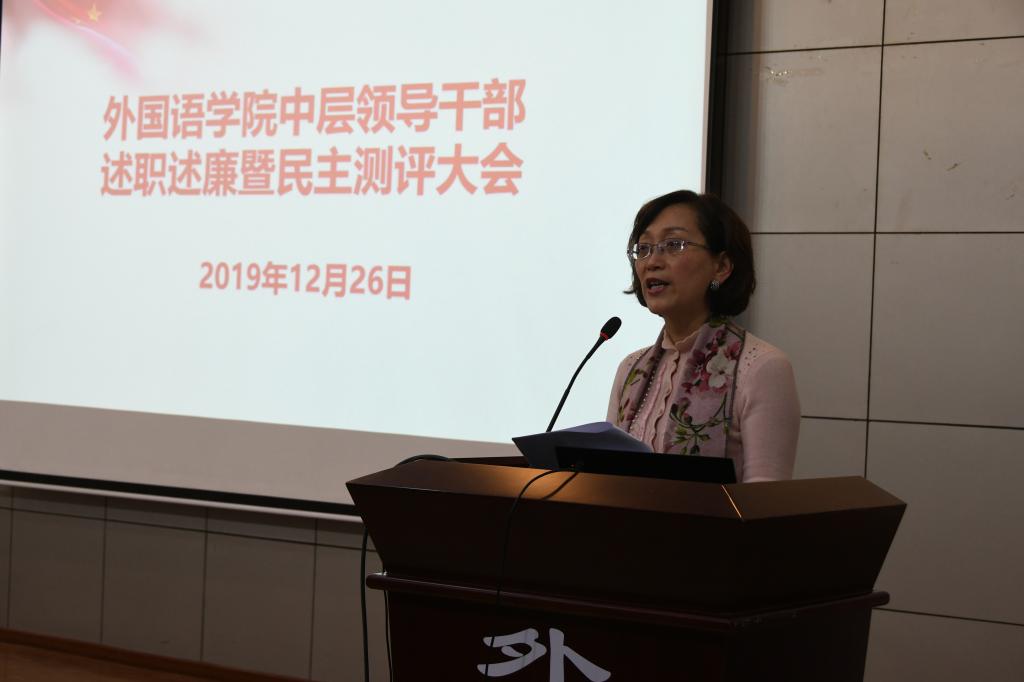 接着,党委书记欧玲代表学院领导班子做了题为《以一级学科建设为抓手,实施人才培养质量工程,推动外国语言文学学科建设实现新跨越》的述职报告,向大家汇报了一年来学院在落实党委主体责任、加强教师队伍建设、提升人才培养质量、提升学科影响力、推进国际合作交流等方面所进行的努力和取得的成绩。2019年是小黄书