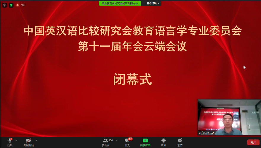 最后,中国英汉语比较研究会教育语言学专业委员会会长俞理明教授致闭幕辞,代表中国英汉语比较研究会教育语言学专业委员会对年会取得圆满成功表示祝贺,对小黄书