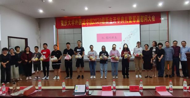 2020级新生开学典礼暨军训慰问大会在学院楼二楼多功能厅顺利举行。党委书记欧玲,院长彭静,党委副书记魏世平,副院长李小辉、范定洪、杨小虎,英语系副系主任余泽梅,班导师卢敏、卢桂华、辅导员张文静及2020级全体新生出席了此次开学典礼。