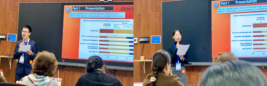 上午8:30-12:10,大赛分非英语专业专科组、非英语专业本科组、非英语专业本科组进行小组赛,各组根据成绩排名共选拔出20名选手晋级决赛。我校参赛选手周佳清、董乐诗与其他20所本科高校的20名选手在非英语专业本科组同场竞争,最终凭出色发挥分别以排名第二、第三的成绩进入决赛。下午14:25-16:30,三组晋级决赛的20名选手分非英语专业本科组和非英语专业专科组同台角逐大赛胜利。随着比赛难度升级及赛场氛围紧张,我校周佳清和董乐诗平衡心态、稳扎稳打,最终分别以第三、第四的排名荣获二等奖。