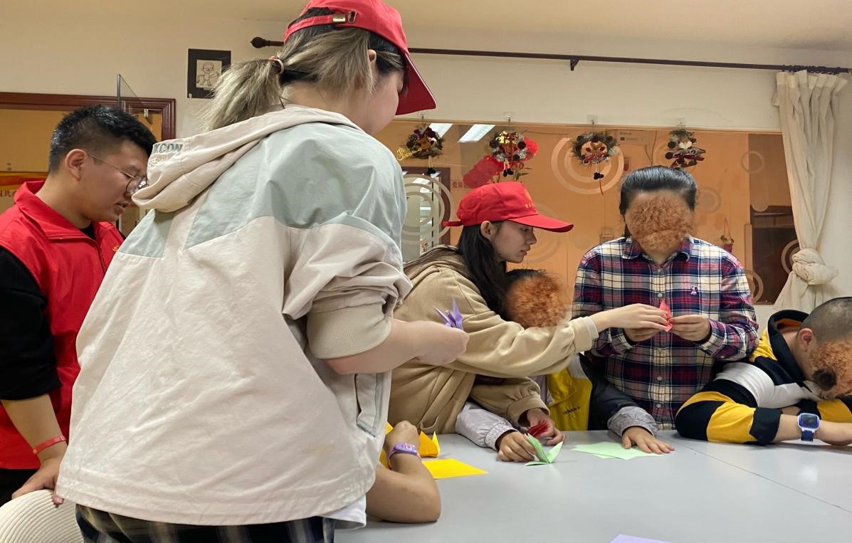 第三个环节是折纸教学。每位志愿者以身示范,亲手教小伙伴们如何一步步将一张纸变成漂亮的千纸鹤和爱心形状。学员们学会后开心地向大家展示自己的折纸作品,与志愿者拥抱、交流心得、合影留念。